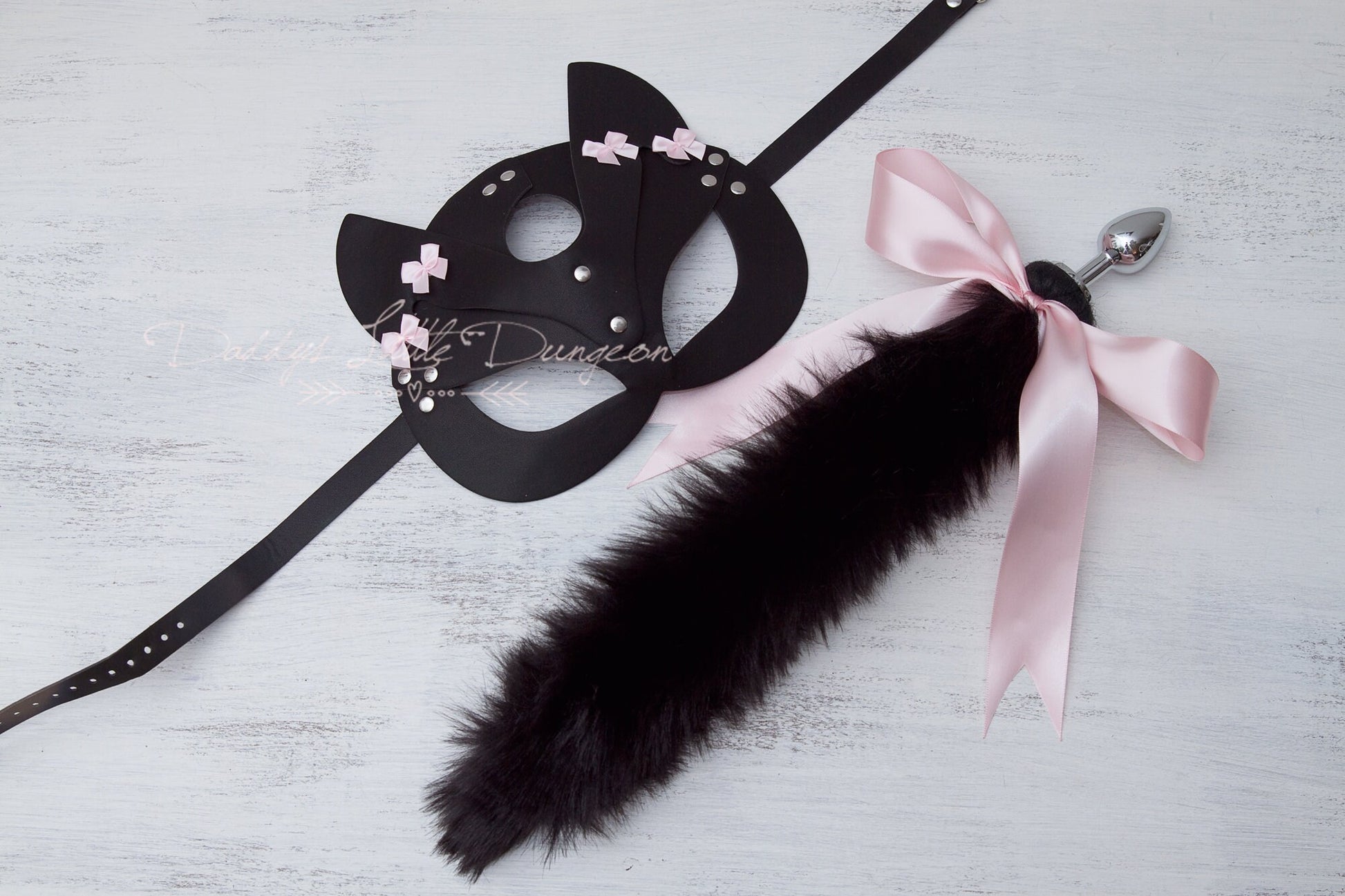 - Luxe vegan faux leather kitten or fox mask with ears, adorned with pink satin bows