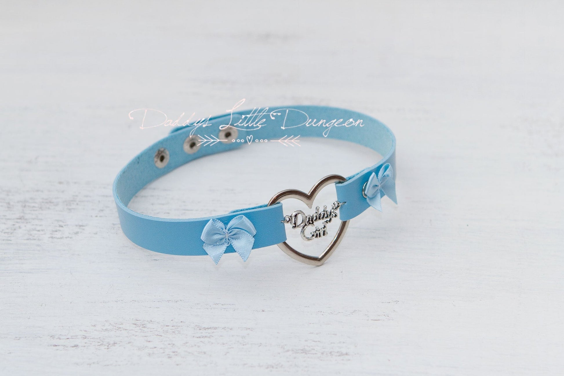 BDSM DDLG Blue Daddy's Girl Charm Heart Day Collar Lolita Choker Satin Bows Pet Play Kitty Submissive Little Baby Kitten Petplay ABDL mature