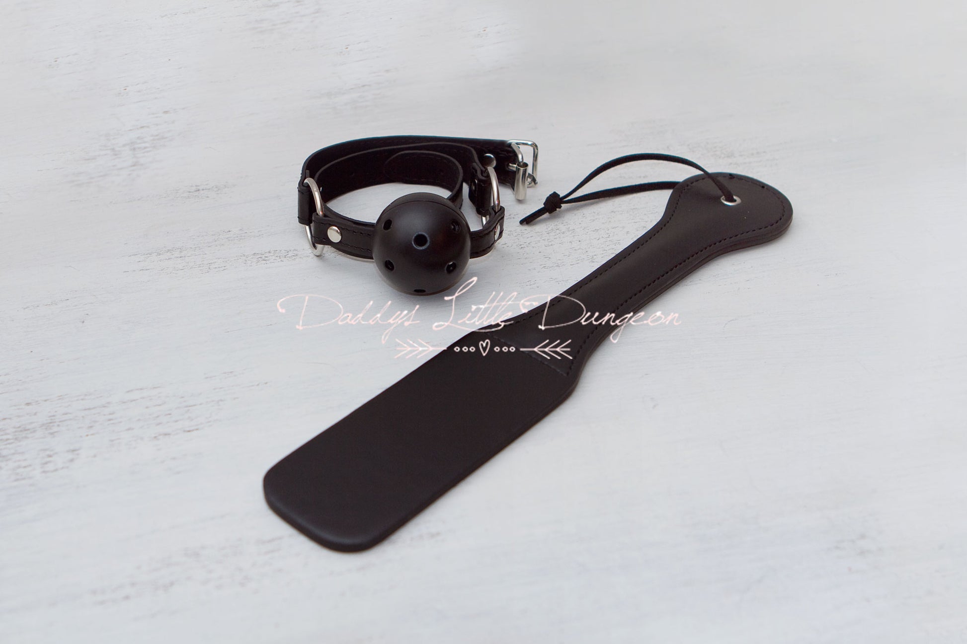 Cute and simple paddle and ball gag set for light spanking and bondage play.