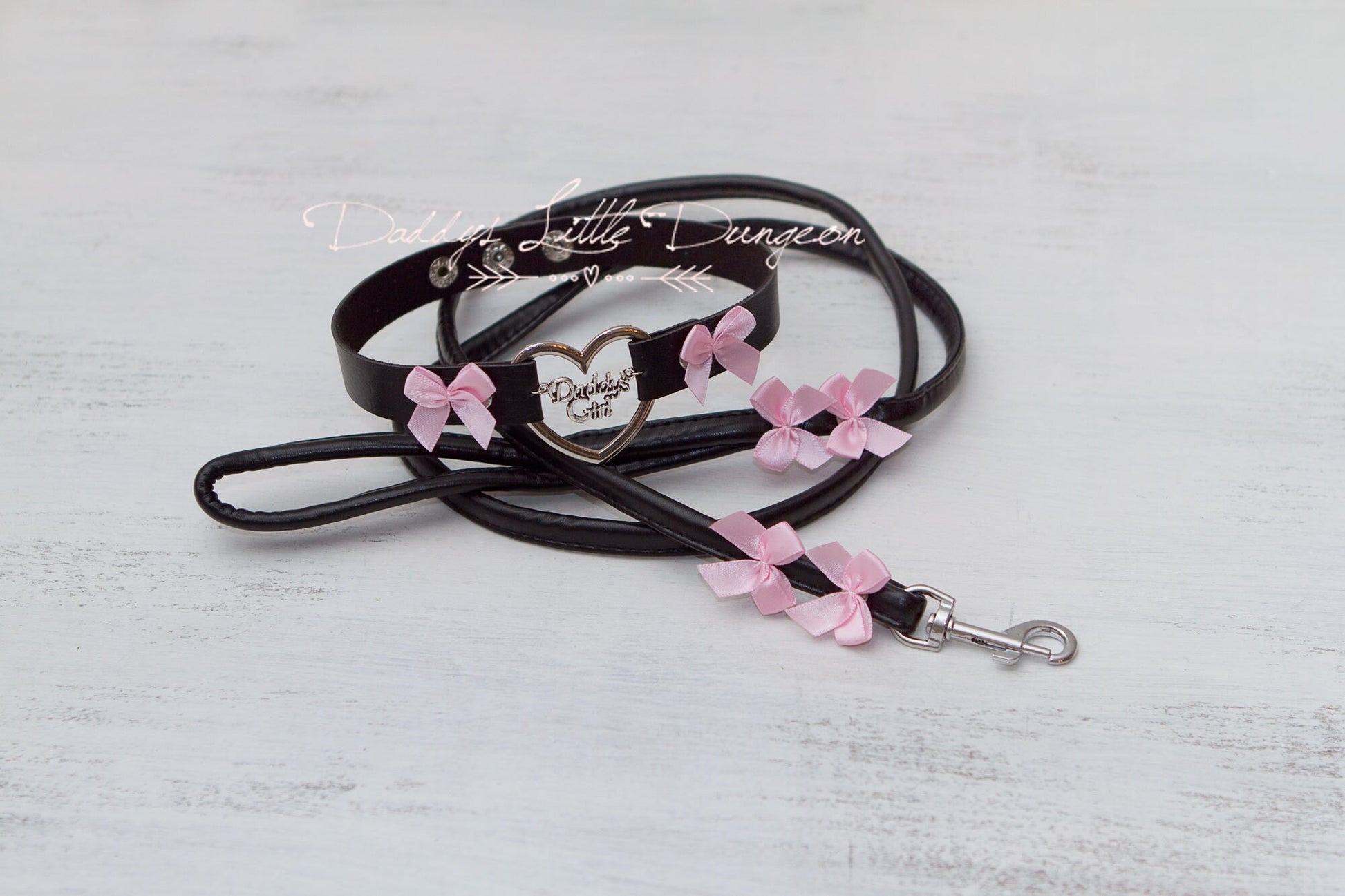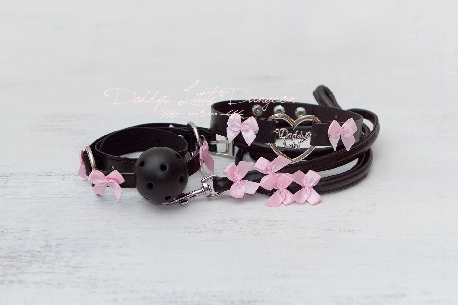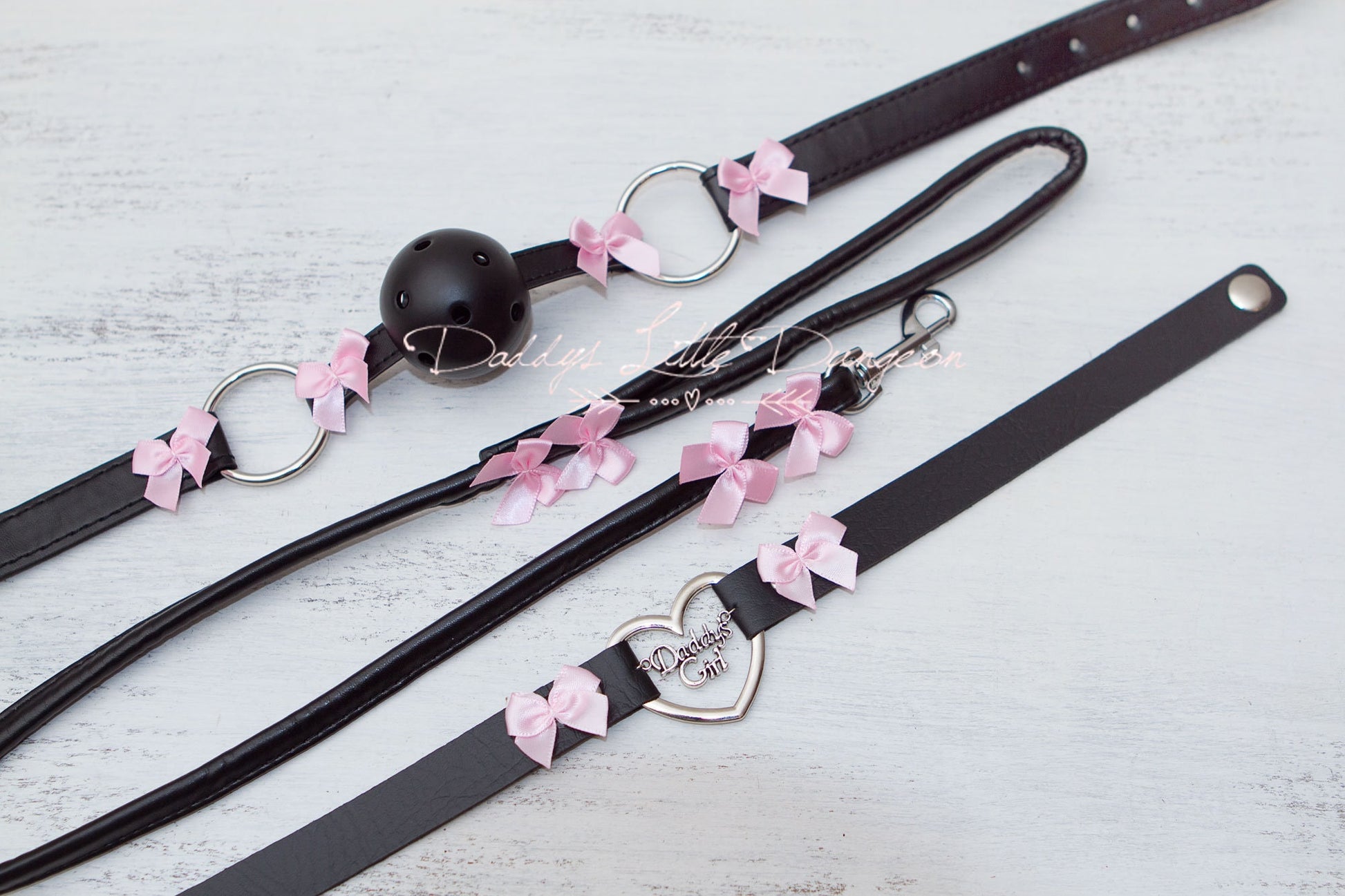 DDLG Pretty Black BDSM Bondage Collar Leash Ball Gag Set Bows Submissive Master Girly Sissy Daddys Little Girl Kawaii ABDL mature Baby mommy