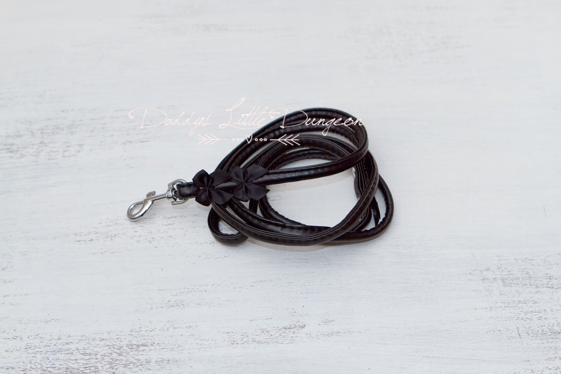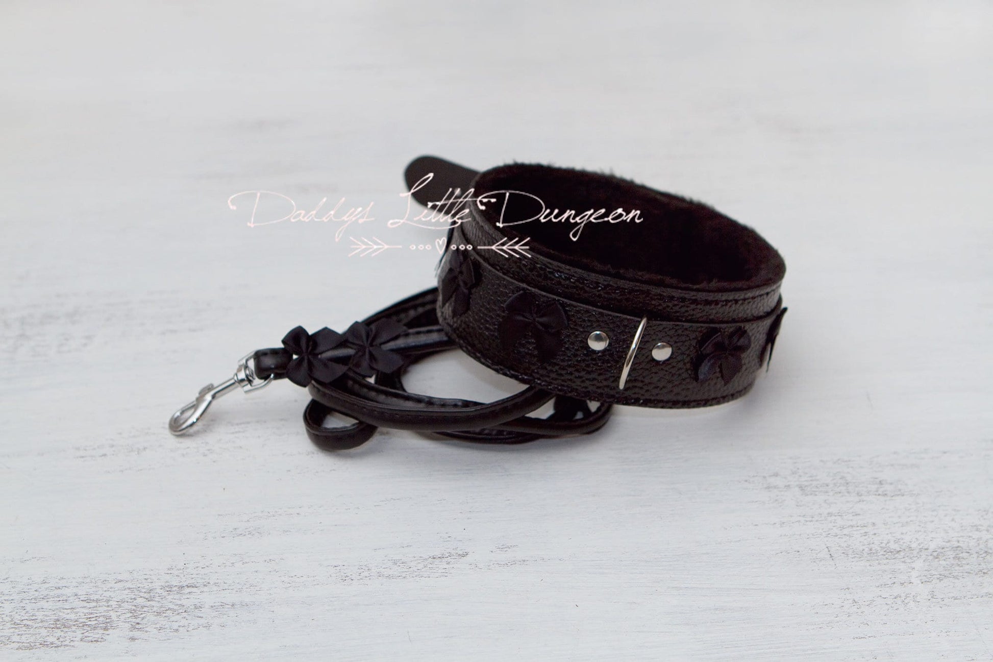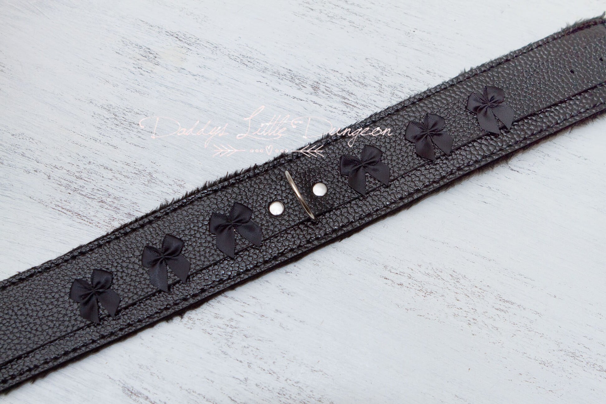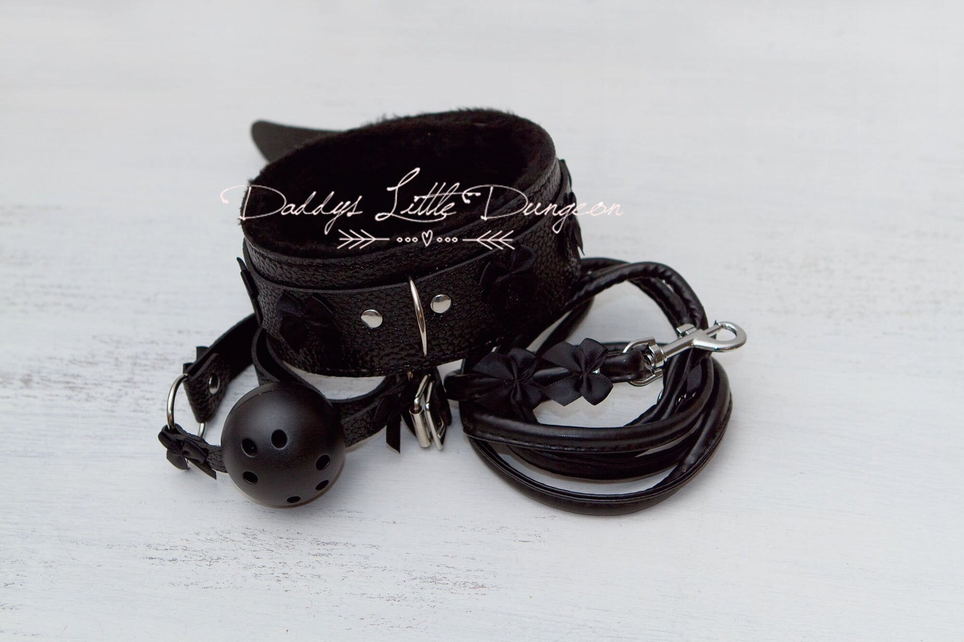 DDLG Pretty Black Furry BDSM Gothic Bondage Collar Leash & Ball Gag Set - Bows Master Girly Sub Sissy Daddys Little Girl Kawaii ABDL mature