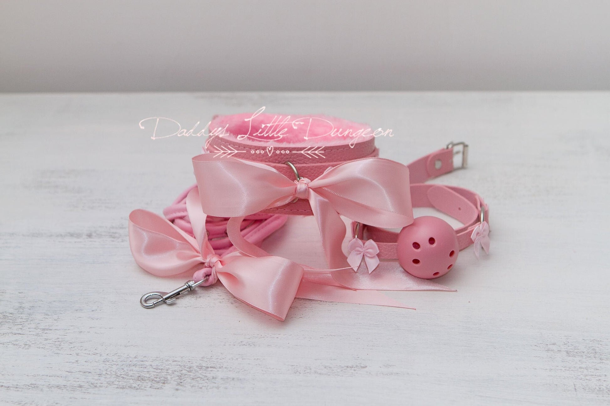 DDLG Pretty Pink Furry BDSM Bondage Collar Leash & Ball Gag Set Satin Bows Sub Master Girly Sub Sissy Daddys Little Girl Kawaii ABDL mature
