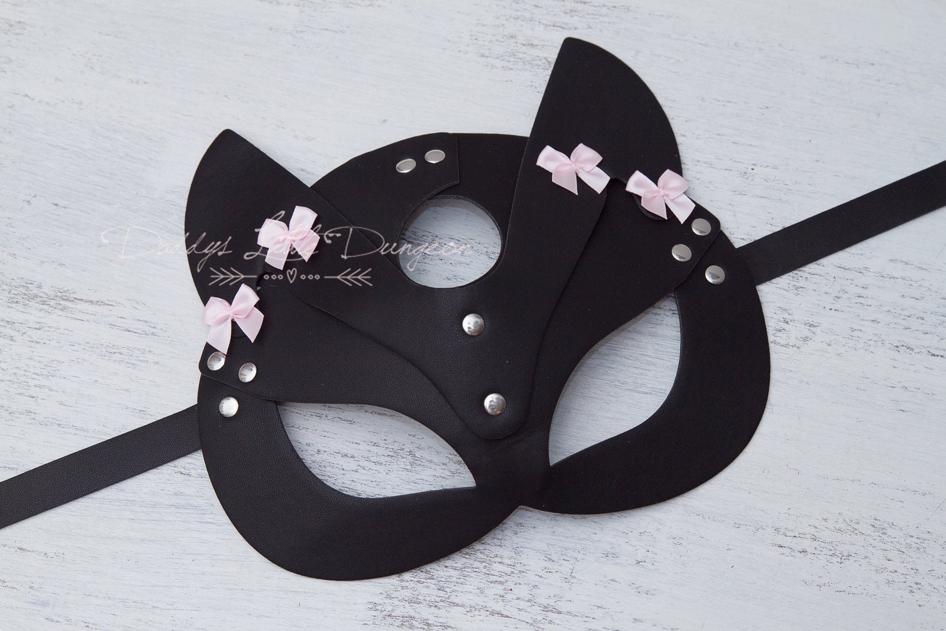 - Luxe vegan faux leather kitty cat, kitten or fox mask with ears, adorned with pink satin bows