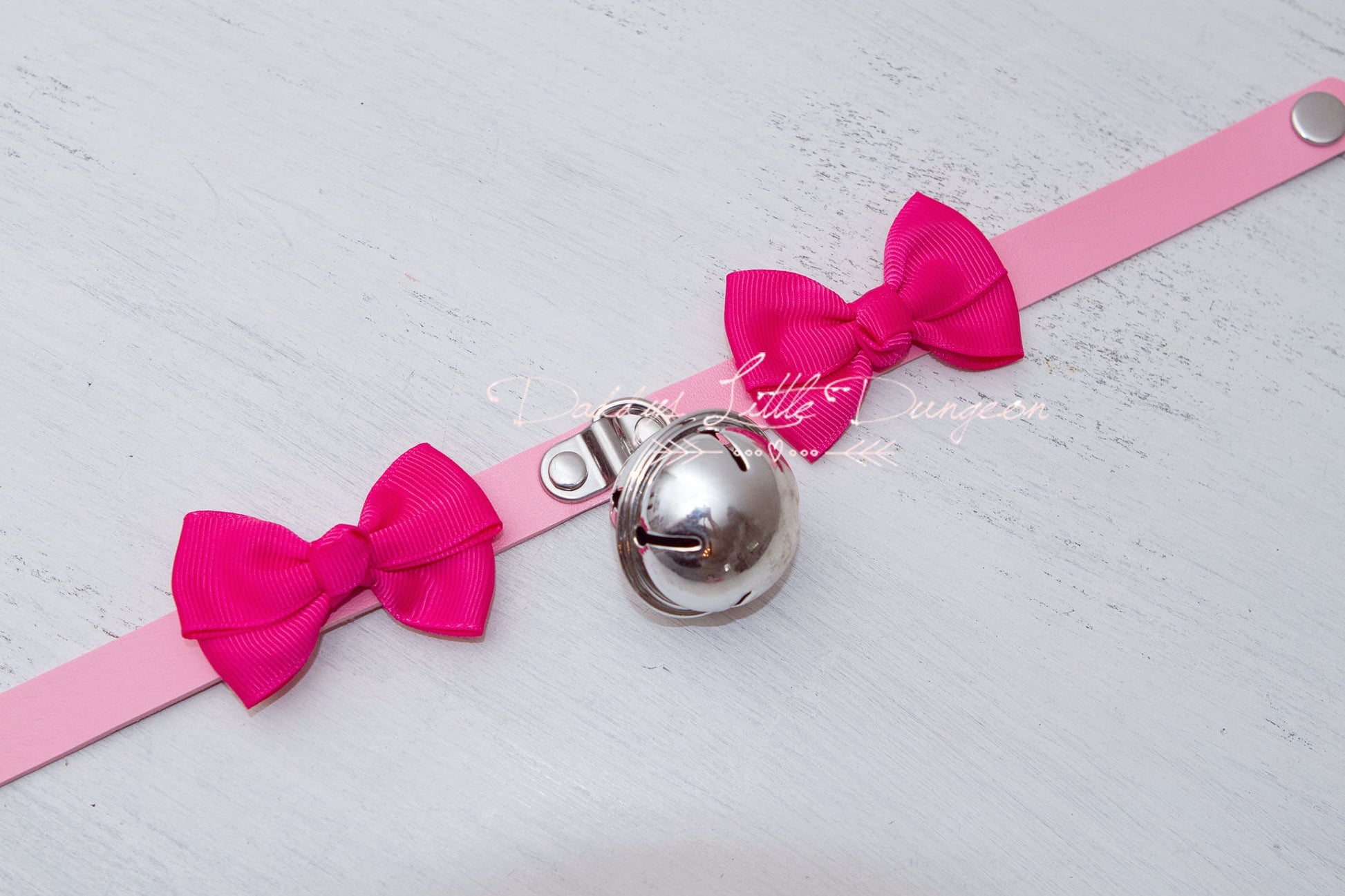 *Pink faux leather collar with matching hot pink bows and silver jingle bell (fits 12 1/2 to 15 inch neck)