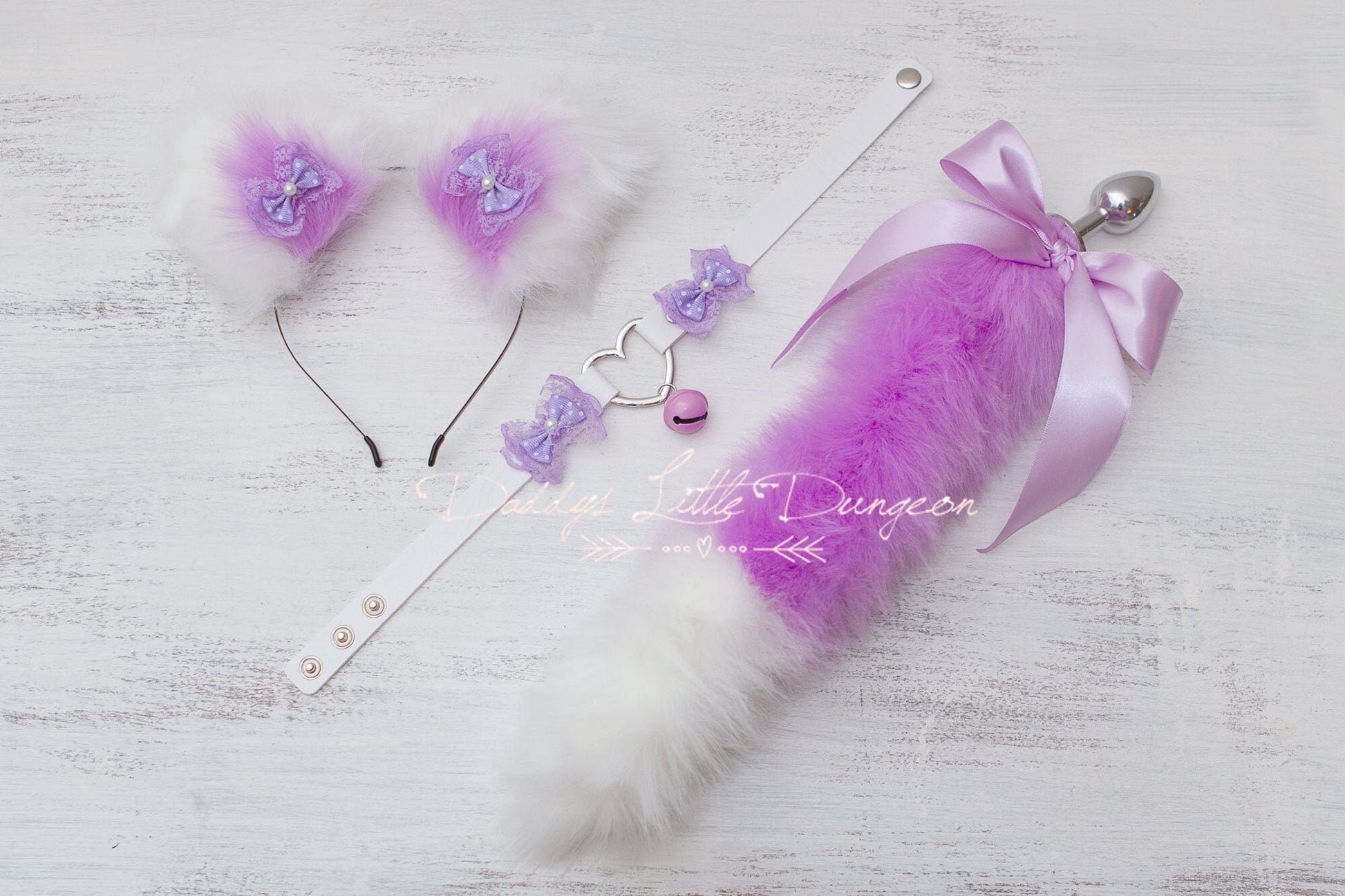 Pet Play Ears Collar Plug Tail set! New to the shop! My most fluffy and furry design EVER! Cute custom designed pretty white and purple BDSM and DDLG Starter Set for pet play / cosplay.