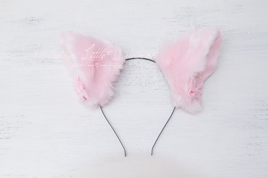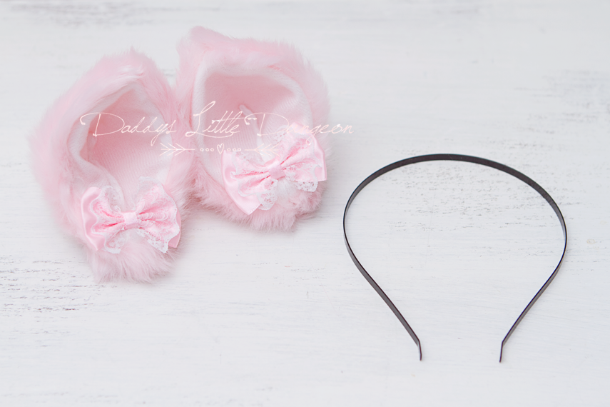 *Big, furry pink kitten or fox ears with white insides adorned with pink satin and white lace layered bows (ears can be worn as clips or slid onto headband)