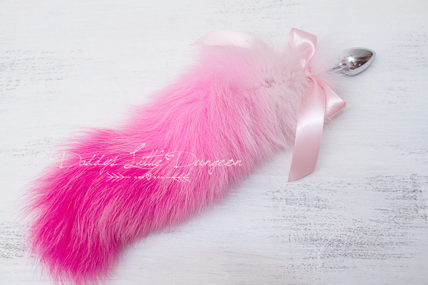 *Extra plush and super fluffy pink ombre stainless butt / anal plug tail (actual fur tail is 14 inches long not including plug), adorned with pink satin ribbon bow