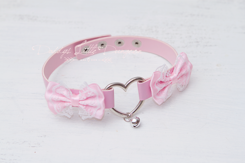 *Pink faux leather collar with matching pink satin and white lace layered bows and silver jingle bell (fits 14 to 15 1/2 inch neck)
