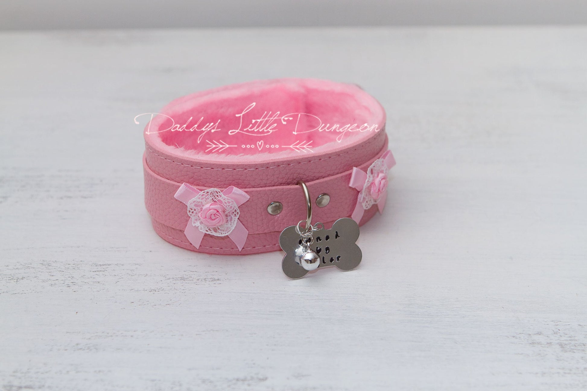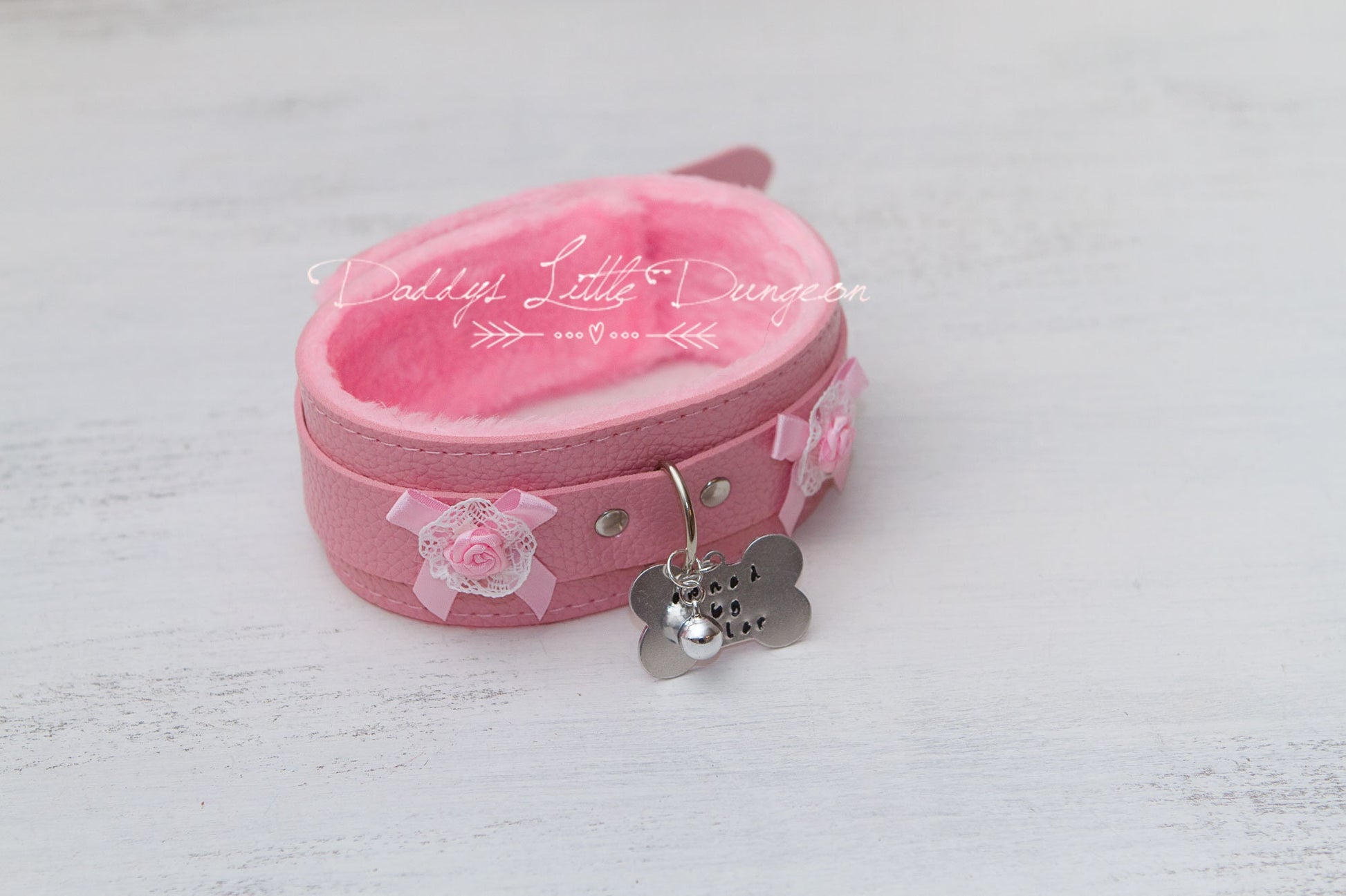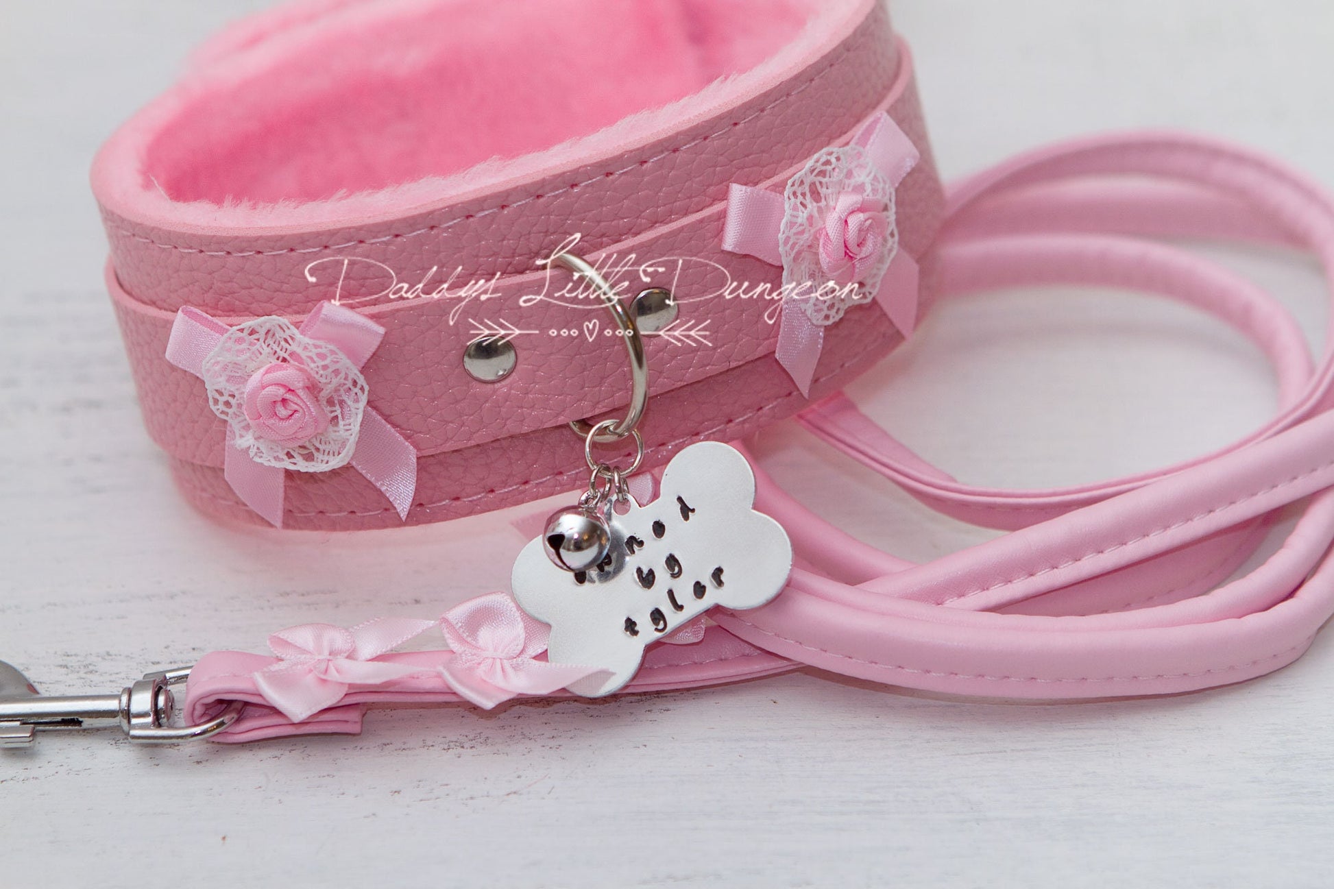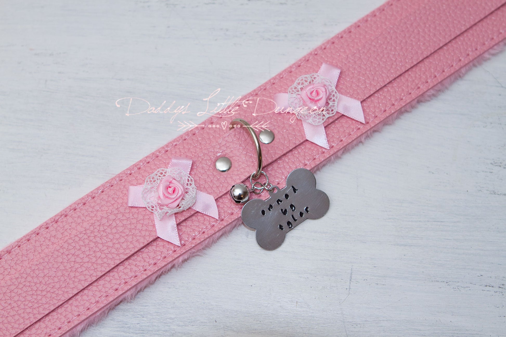 Pink Personalized Tag Fur BDSM Bondage Collar & Leash Set with Roses and Bows for Petplay, Cosplay, DDLG, Daddys Little Girl ABDL mature