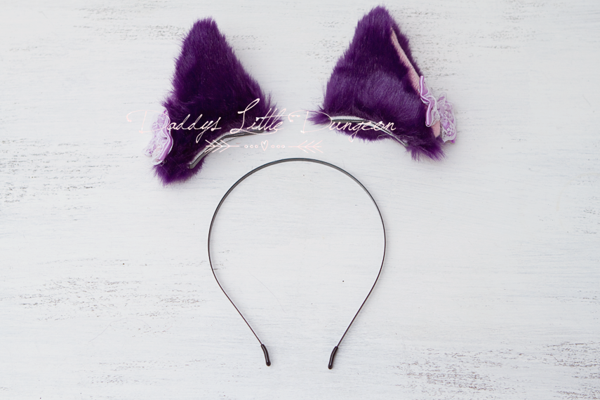 *Big, furry purple kitten or fox ears with pink insides adorned with lilac satin and white lace layered bows (ears can be worn as clips or slid onto headband)