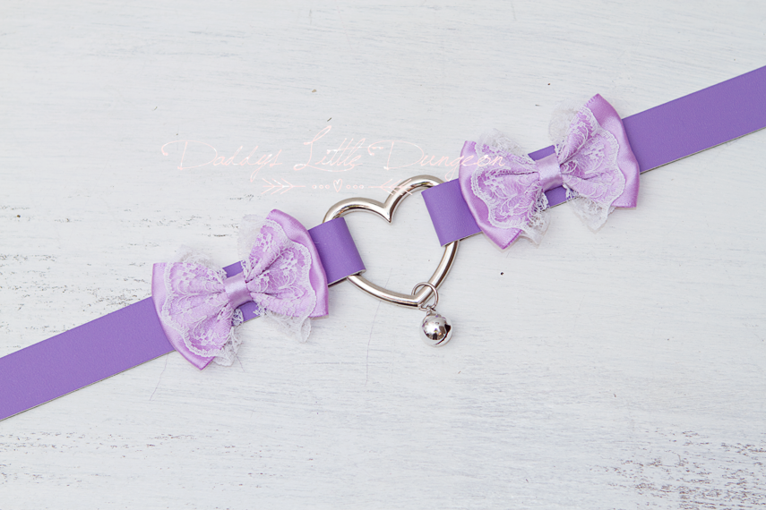 *Purple faux leather collar with matching lilac satin and white lace layered bows and silver jingle bell (fits 14 to 15 1/2 inch neck)