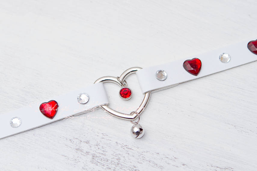 Sparkly custom designed pretty white and red kitten day collar for pet play with luxe crystals.